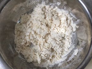 和面。向面粉中少量少量加水,用筷子拌成絮状,注意最后要留一点干面粉。