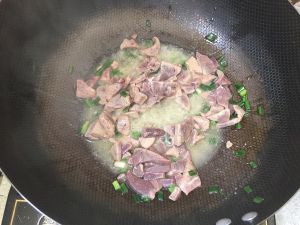 起炒锅,加少许油,油七成热后加入小葱爆香,然后加入猪肝翻遍。