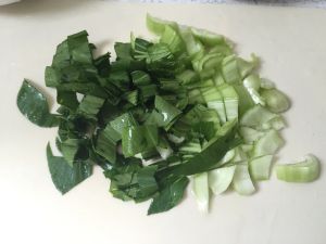 小葱洗净后切小段。浸泡过的猪肝切小块,菜就备齐了。
