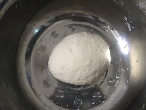 将絮状揉到一起,揉成光滑的面团,干面粉也一起揉进来,不要多加水,不然面团会太软,揉好后醒半个小时。