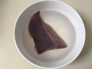猪肝,水流冲洗干净后,再用清水浸泡半个小时。