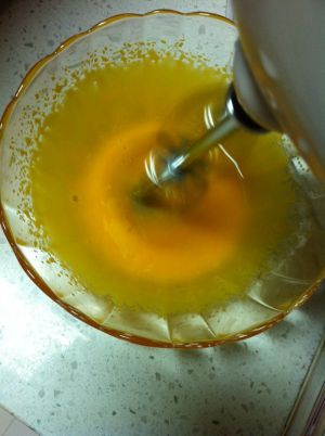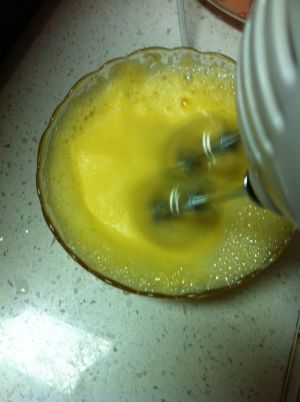 将糖水和蛋黄一起搅打7、8分钟,搅打后的蛋黄糊渐渐冷却,放置备用,一定要冷却备用