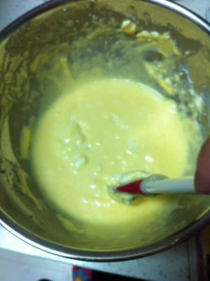 将打好的蛋黄缓慢倒入糖水中搅拌均匀 慢慢冷却到常温状态 打到像泡沫一样浓稠状