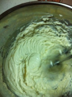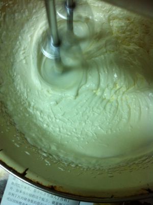 打蛋清,蓬松起沫后加2大勺糖,打出奶油装后,再兑入125克的mascarpone.打均匀。再用一样的方法打蛋黄酱。