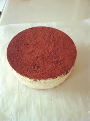 凝固好的芝士糊脱模,洒上一层可可粉,6寸提拉米苏就完成啦(可可粉吃之前洒,防止受潮)