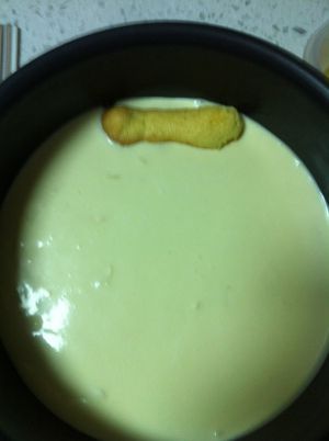 倒入一半的芝士糊,再铺一层蘸了咖啡酒的手指饼干