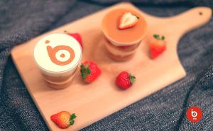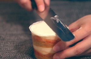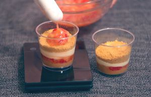 再铺上一层草莓酱(如图左边杯子),将乳酪糊装入裱花袋,前边剪个小口,画圈儿的方式挤在草莓酱上(如图右边杯子)。