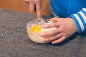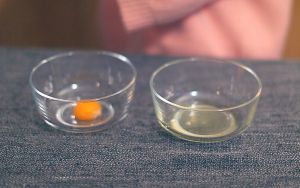将可生食鸡蛋,蛋白、蛋黄分离到两个空碗中。