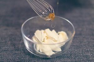 奶油奶酪切块儿提前放室温软化,加入蜂蜜,然后用手动打蛋器搅拌均匀。
