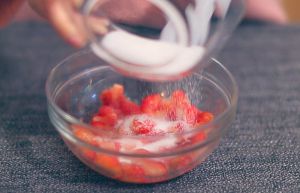 先来制作奶酪糊:细砂糖、柠檬汁加入到草莓中压碎成酱状。