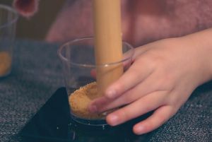在模具杯子底部先铺一层消化饼干碎,用擀面杖压几下。