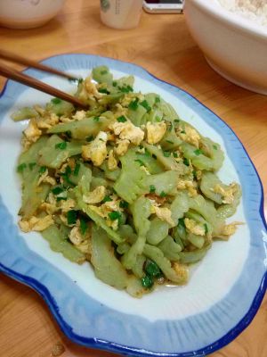 大火热油,下苦瓜片快速炒软,加入鸡蛋块,盐,炒至均匀即