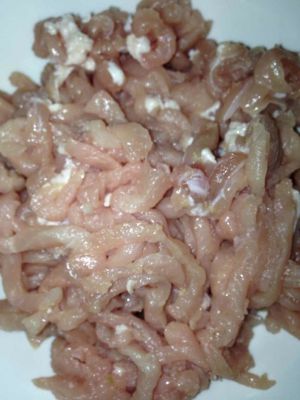 里脊肉切丝,加蛋清,淀粉,少些生油。冰箱冷藏室放置十来分钟。