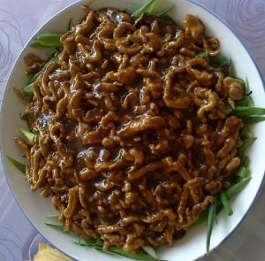 面酱入锅翻炒 加少许水 及调料后倒入肉丝 翻炒至每个肉丝均变色后 加少许淀粉勾芡后 盛入摆好的葱盘里即可