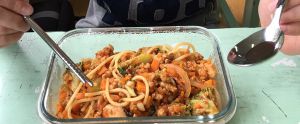 锅下油,放大蒜,洋葱炒出味道放肉末,翻炒加红烧酱油,颜色就出来了,然后放香菇,西兰花,萝卜,翻炒到熟,再加入用搅拌机打碎的番茄汁,烧到收汁拌入意大利面就可以了。