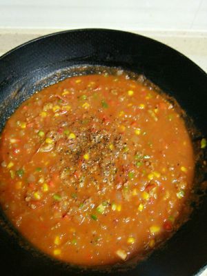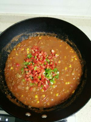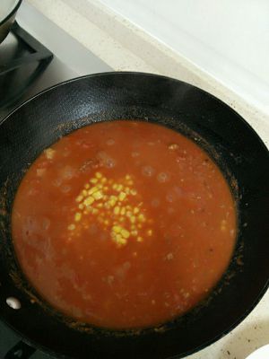 15分钟后,番茄基本炖烂了,加入玉米粒,期间适当翻拌。