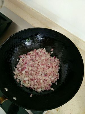 平底锅加油烧热后加入少许洋葱末,炒香加入牛肉末儿,断生,盛起备用