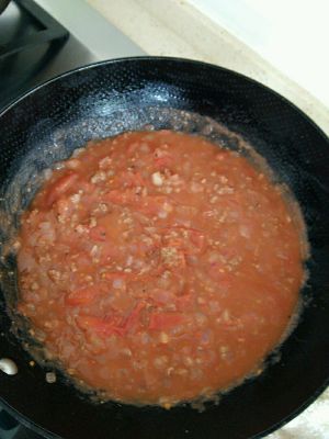 平底锅烧热加入橄榄油,稍热后加入小块黄油,待黄油化开加入洋葱翻炒出香味,加入番茄泥,慢慢炒出尽量多的番茄汁,加入之前的牛肉末儿,加少许凉开水,待水和番茄很好的融合后加入黑胡椒,少许红酒,番茄酱,煮5分钟加入盐,酱汁就好了;