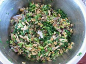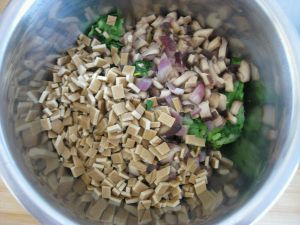 豆干切丁,和炒好的香菇以及挤干水的青菜拌匀。