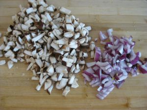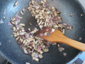 锅中放少量植物油,把香菇和洋葱炒软,加生抽调味。