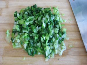 水烧开,加油,加盐,再加青菜串水。这样蒸出来保准菜叶不会发黄。出水的青菜里面放冰水,或者凉水中迅速降温。再挤干,切粒。↜(ψ•̀ ˇ•́ )✁