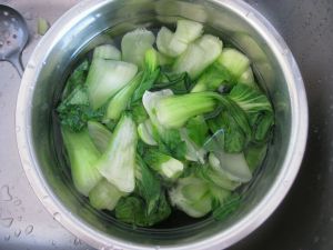 烧一锅开水,放一勺盐,把青菜汆烫10秒,捞出过冷水。