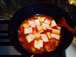 再待锅开,加入豆腐。个人喜欢把豆腐做成冻豆腐来煮泡菜汤。但在此为给大家展示传统做法,加入的是没有冻的豆腐。