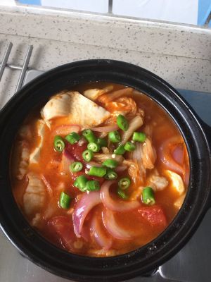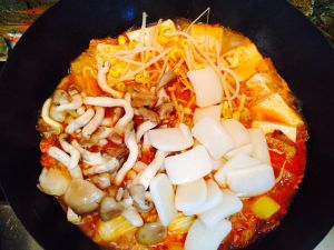 豆腐与其它配菜滚熟时➕一勺辣椒酱➕适量泡菜