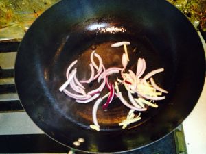 锅里放油,把洋葱和生姜切丝油热后放入炒出香味