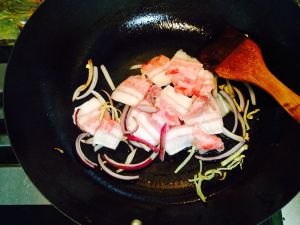 放入五花肉炒至出油
