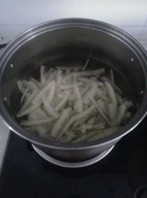 烧开一锅水,把切好的西瓜皮洗干净后放进沸水焯一下,立即捞出。