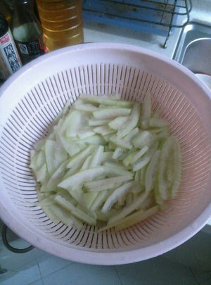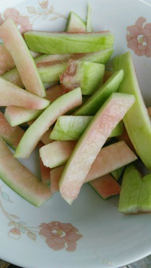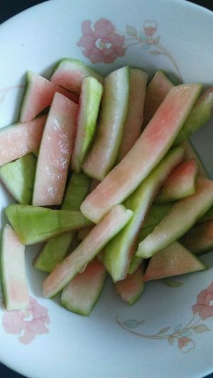 准备一些吃剩的西瓜皮,切成小薄片。