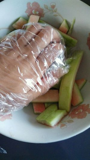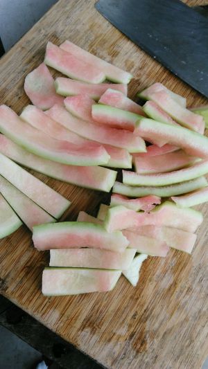 西瓜皮去瓤去皮,红色的去干净,因为比较软不脆,而且有明显的甜味。