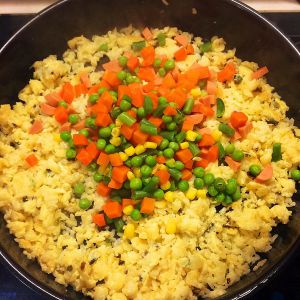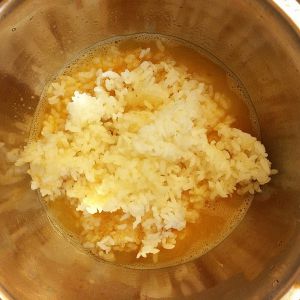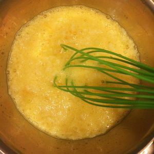 米饭晾凉后倒入打散的鸡蛋拌匀备用
