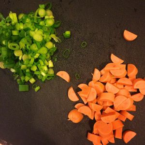 倒入炒好的胡萝卜、火腿,加入葱花、盐