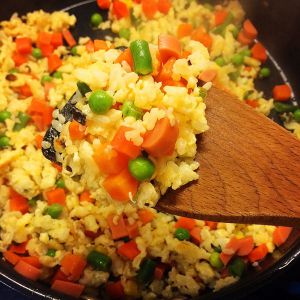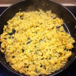 余下底油烧热后入米饭炒至米饭外裹的蛋液熟透