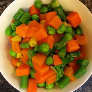 取锅加上烧开,倒入青豆,胡萝卜粒和玉米粒,捞出过冷,沥干水备用