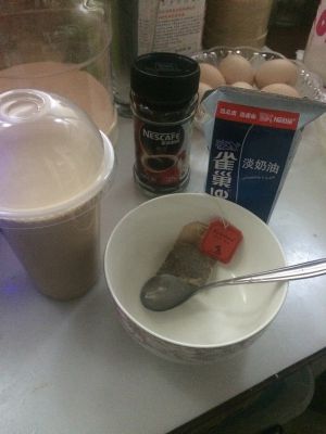 烧开水泡茶包,把咖啡粉也倒进去冲