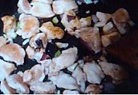 热锅热油下鸡丁翻炒,待鸡丁变色加洋葱 ,再依次加入土豆,胡萝卜,豌豆米。