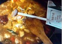 小火煮,咖喱汁会慢慢收,适当搅拌以免糊锅。煮的过程中放“少许”牛奶,可以让汁更浓郁更美味。(乳化效果会让咖喱汁变的更浓郁:)