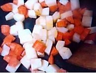 土豆胡萝卜去皮切小块,放少许油炒一下,盛盘备用。 (闻到香香的土豆味,表面有金黄色了就可以了)