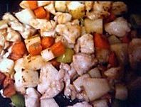 倒入油30g热锅,放鸡丁,土豆丁,胡萝卜丁,洋葱丁一起下锅翻炒