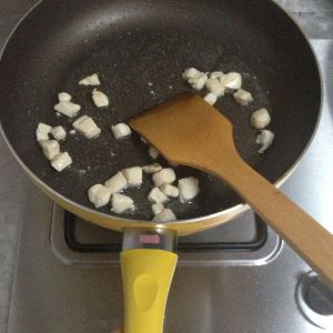 锅中加入少量橄榄油,油热后加入鸡肉丁,简单翻炒至肉丁表面一半泛白,出锅备用。