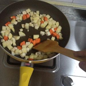 加入土豆、胡萝卜一起翻炒至土豆出香味儿。