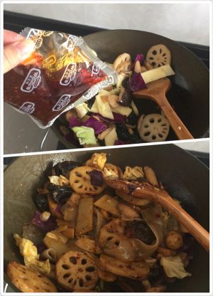 煮熟捞出备用 起锅倒油 一小勺豆瓣酱炒香 下麻辣香锅料 倒入煮好的菜 翻炒均匀即可
