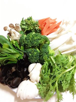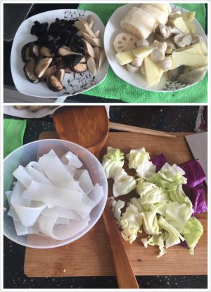 所有食材洗净,按口味喜好切片或切块,葱姜切片、洋葱切丝、香菜洗净切段备用。烧开一锅水,水中放一小勺盐,分别将各种蔬菜、蘑菇、鱼丸,千叶豆腐等入锅焯熟,捞出后控干水分。