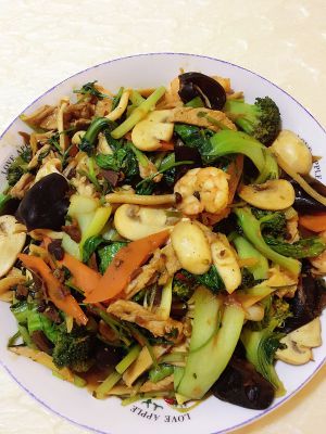 依次放入煸炒过的肉、虾、菌类、最后放入青菜翻炒,加盐,