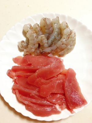 肉切片、虾去皮剔黑线。 肉、虾需要先煸香备用。