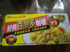 大火开锅后加入3块咖喱,搅拌融化。我用的是咖喱块,这个牌子的咖喱味道比较好吃。