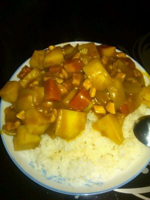 倒油,放入切好的鸡丁,炒至鸡肉发白,倒入土豆块,胡萝卜,洋葱翻炒,菜差不多熟后加水。加咖喱,撇去浮末,加入米饭。稍加一点淀粉,翻炒至愁愁的就OK啦!